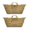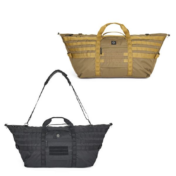 60Lのダッフルバッグです。前後に付いているスリーブは、旅行用トロリーバッグのハンドルに挿入して使用可能です。モールシステムはタクティカルアクセサリーに互換性があります。