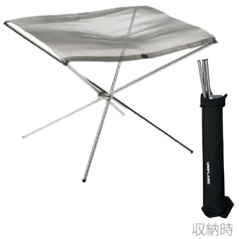 特殊耐熱鋼メッシュを採用し、巻いてたためるコンパクトな焚火台。ツーリングやバックパッキングにも携帯できる軽量490g。メッシュの網目は0.96mm目、火が落ちることはほとんどありません。直火OKのキャンプ場から直火禁止のキャンプ場へと変遷が進んだ90年代にはキャンプでの焚き火の楽しさが失われつつありました。地面にダメージを与えないよう、「携帯型のファイアプレイス=焚き火の台」として1996年にUNIFLAMEから初代ファイアスタンドが誕生し、改めてキャンプの焚き火が定番化しました。