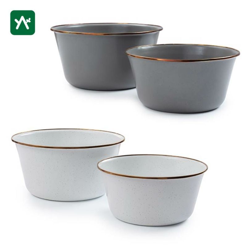 Barebones ベアボーンズ エナメルミキシングボウル 2サイズセットはサイズの違うボウルで湿った材料と乾いた材料を混ぜて、お菓子やパンなどを作ることができ、キャンプキットにもキッチンでの料理にも十分な耐久性と洗練されたデザインを備えたミキシングボウルセットです。手仕上げの焼き付けステンレススチールのトリムで補強されています。