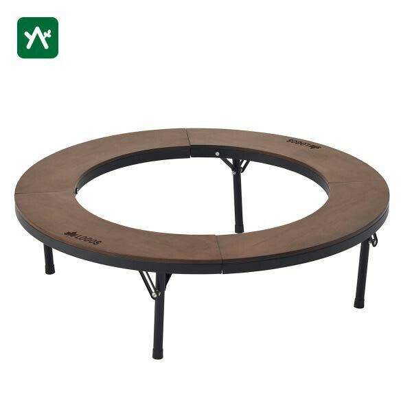 自然と調和する木製天板。囲炉裏スタイルで、たき火やグリルを囲む円形テーブル。