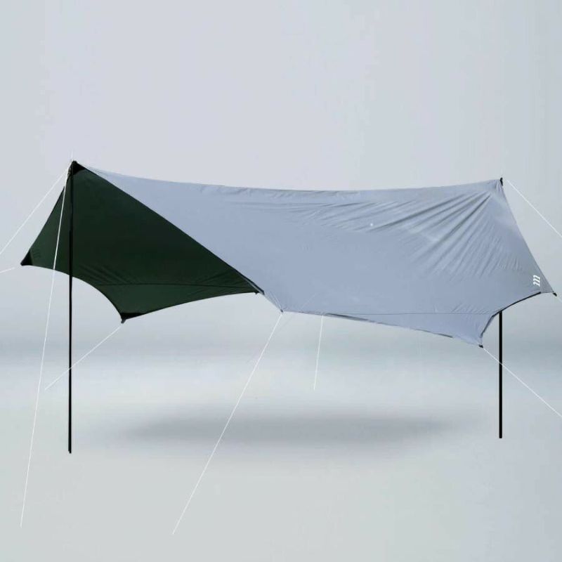 遮光性と排水性に優れたアシンメトリー形状のタープです。生地の裏面にシルバーカラーのPUコーティングを施すことで光の透過を極限まで抑え、濃い影を作り出します。フチには雨どいが付いているので、コーナー部分から雨をスムーズに排出できます。左右非対称の形状により、テントに連結させた設営に適しています。様々な気候・地形でテントと組み合わせて最適な形状を作り出すことができます。2?4人に適したサイズです。