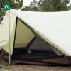 ペンタイーズをベースに拡張、快適にくつろげる前室を設けています。雨でも生活空間を確保することができます。キッチン・リビングとして必要十分な前室スペースと、既存のソロテントに劣らない屋内空間。長さの違う2本のポールを前後に配置することにより、天井の高い、ロースタイルにぴったりの前室空間を創出しました。