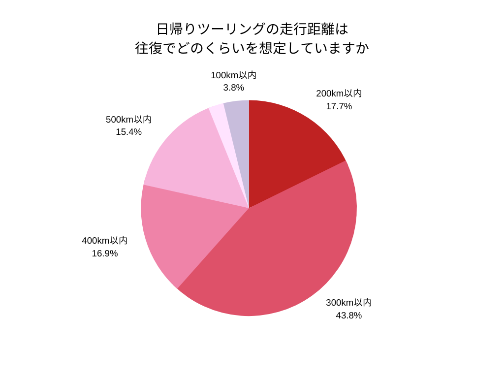 8割以上の人が日帰りツーリングは往復400㎞までと考えていることが分かる。