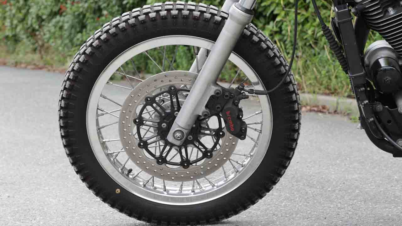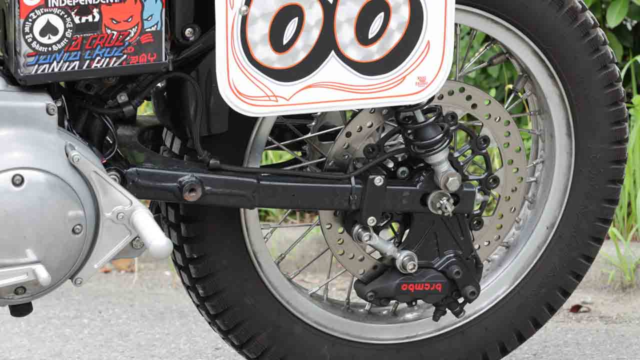 リアホイールはRKエキセル製Hリムを使用して18インチにサイズアップ。フラットトラッカーらしいシルエットを実現した。ミスミエンジニアリング製ローターとブレンボ製キャリパーによってリアブレーキも強化済みだ