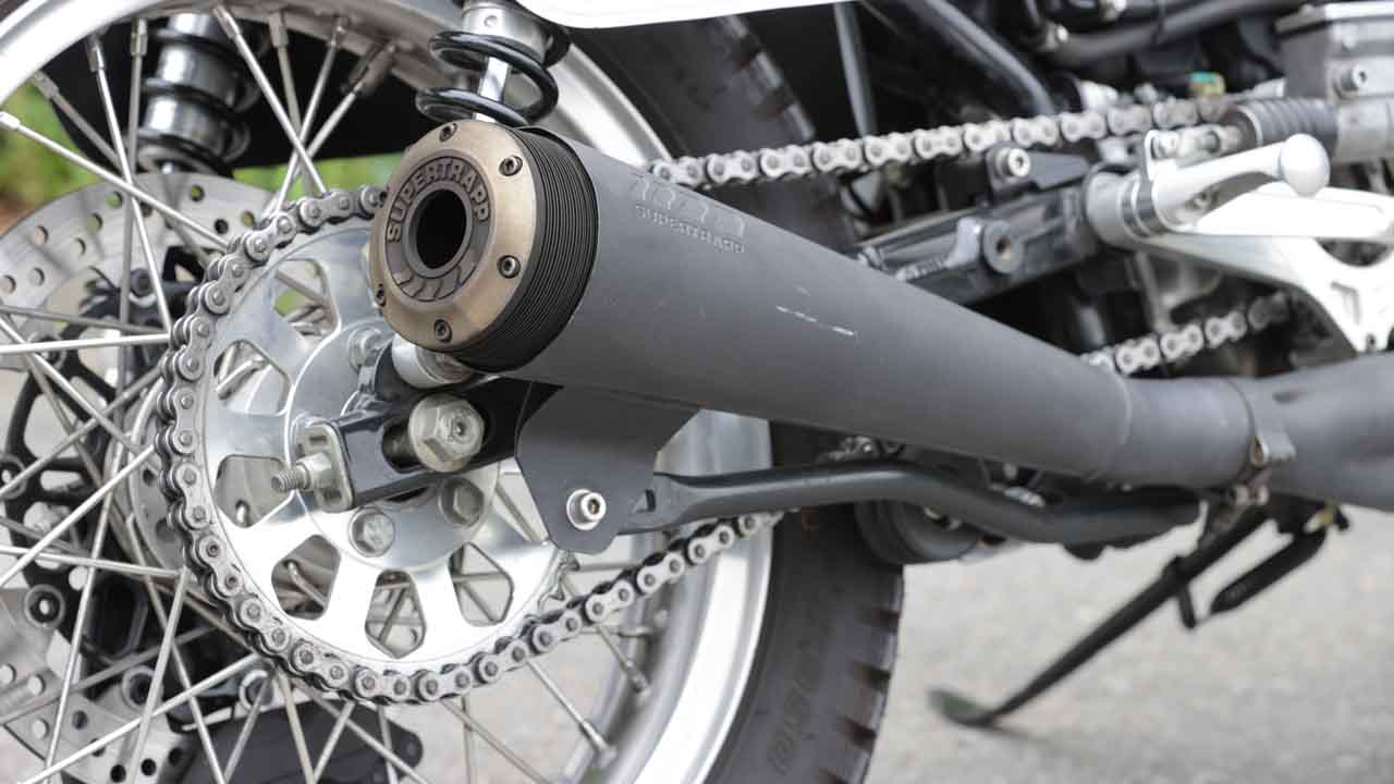 マフラーはこのスタイルで定番となっているスーパートラップ製だが、2本出しのハイパイプではなく2イン1タイプをセレクトしている。また、ドライブチェーン化によってリアまわりはスポーティな印象だ