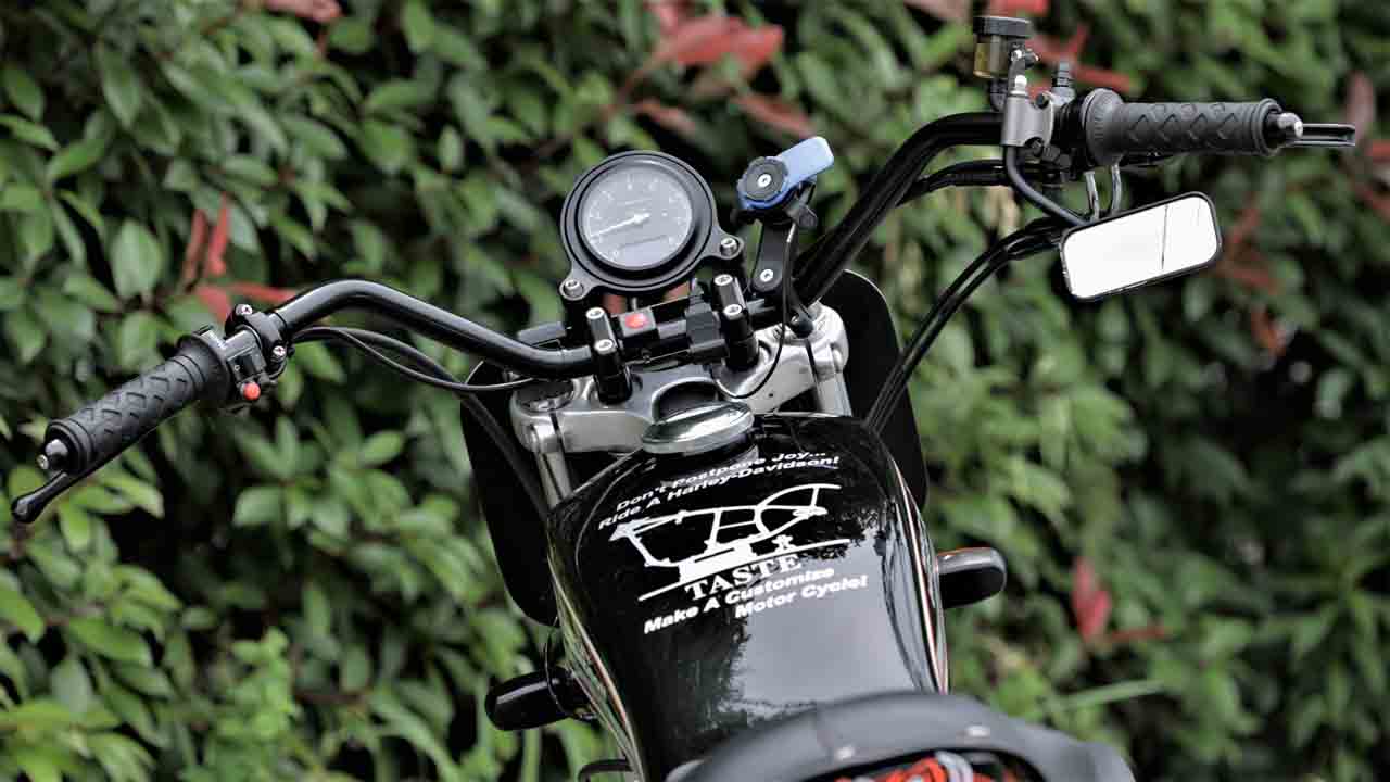 ハンドルは国産車と同じミリバーに変更して操作性を向上。その中央にはモトガジェット製のマルチタイプメーターが鎮座。一見するとタコメーターひとつしかないように見えるが、液晶部分に速度をデジタル表示する。いまスポーティ志向のユーザーの間で定番となりつつあるメーターだ